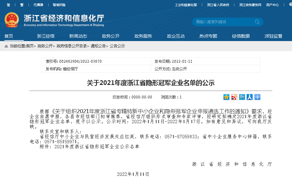 捷报频传:工锅喜获2021年度浙江省隐形冠军企业称号